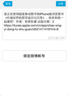 可以将正在读的图书分享给好友,绑定微博即可体验。