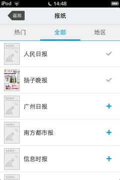 第一步:点击首页中“添加订阅”或者右下角的加号图标,进入内容中心,读者可以订阅自己感兴趣的新闻频道或报纸视频等如图所示: