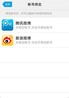 5.账号绑定:点击“账号绑定”,读者可以绑定自己的微博账号,包括新浪微博和腾讯微博,绑定后可以随时分享给好友。