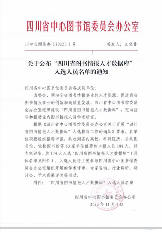 近日,四川省中心图书馆委员会办公室发布《关于公布“四川省图书情报人才数据库”入选人员名单的通知》,我校图书馆副研究馆员何宗亮老师成功入选人才数据库。