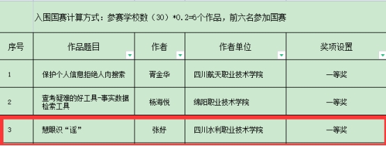 本届信息素养大赛四川赛区组委会非常重视,精心组织,各参赛校大力宣传,参赛人数再创高峰。我校图书馆积极响应赛事组委会号召,精心组织了66位同学参加校赛。经过选拔,共有13位同学参加了省赛的角逐。其中,祝铖与彭林同学脱颖而出,分获第22名和28名,以省赛一等奖的佳绩闯入国赛。在教师微课赛方面,张妤老师以省赛第三名闯入国赛,她的作品题为《慧眼识‘谣’》。